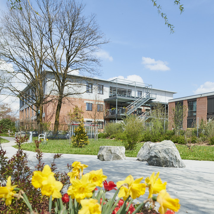 Im Erdgeschoss der Häuser befinden sich unsere Demenzabteilungen mit direktem Zugang zum weitläufigen Demenzgarten. Im Sommer laden hier schöne Pergolas und Hollywoodschaukeln zum Verweilen ein. Die höher gelegenen Pflegeabteilungen verfügen über begrünte Balkone oder Terrassen.