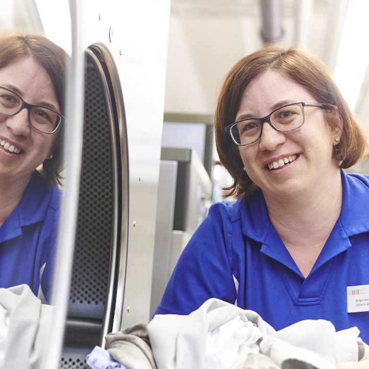 In unserer Wäscherei wird gewaschen, gebügelt, gefaltet und geflickt. Auf Wunsch werden auch Kleidungsstücke beschriftet oder abgeändert. Ein Teil unserer Wäschemenge wird zudem vom «Waschwerk Hindelbank» verarbeitet.